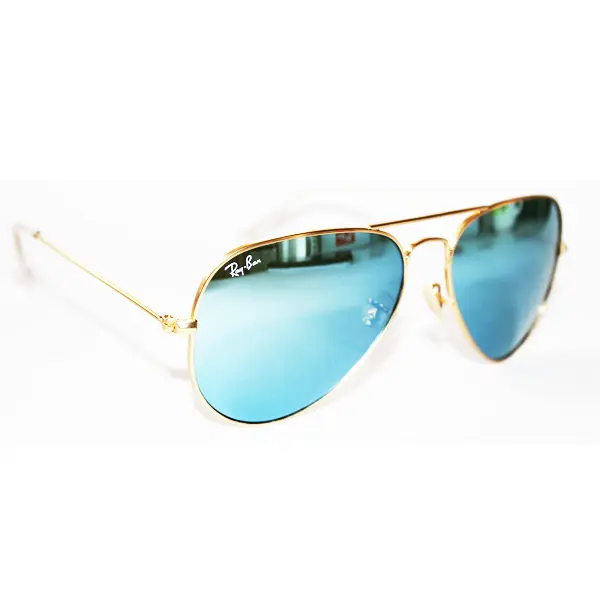 Ray-Ban FOLDING con montura dorada y lentes con efecto espejo azul.